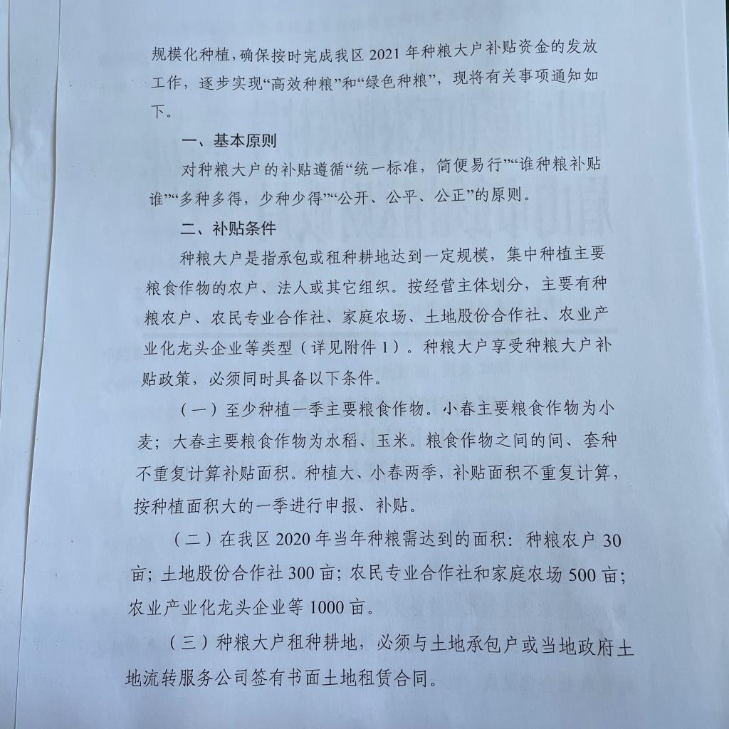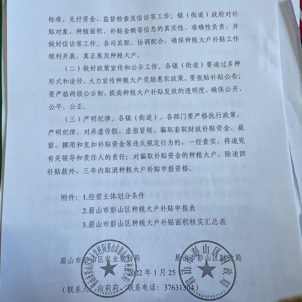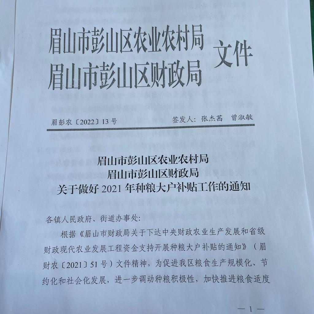 眉山市彭山区农业农村局 区财政局发布《关于做好2021年种粮大户补贴工作的通知》