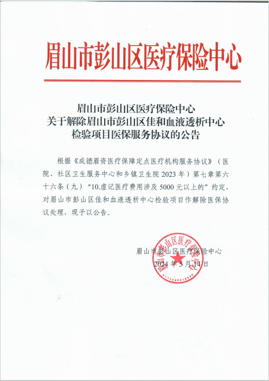 关于解除眉山市彭山区佳和血液透析中心检验项目的医保服务协议的公告