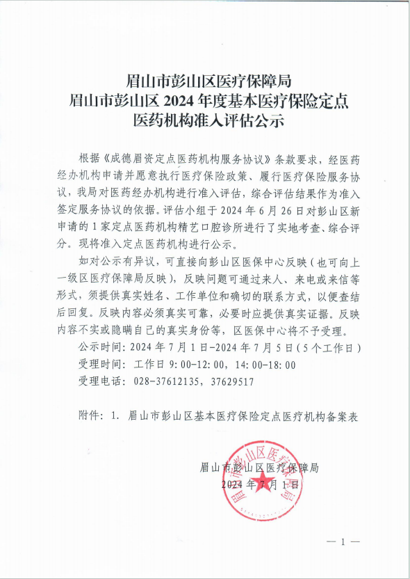 眉山市彭山区2024年度基本医疗保险定点医药机构准入评估公示(7月1日)