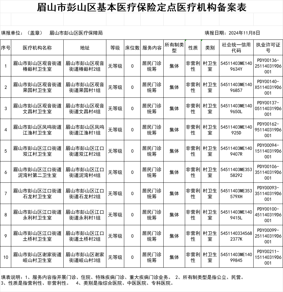 根据《成德眉资定点医药机构服务协议》条款要求,经医药经办机构申请并愿意执行医疗保险政策、履行医疗保险服务协议,我局对医药经办机构进行准入评估,综合评估结果作为准入签定服务协议的依据。评估小组于2024年10月29至30日对彭山区新申请的10家定点医药机构眉山市彭山区观音街道椿巅村卫生室、眉山市彭山区观音街道果园村卫生室、眉山市彭山区观音街道文昌村卫生室、眉山市彭山区凤鸣街道江渔村卫生室、眉山市彭山区江口街道双江村卫生室、眉山市彭山区江口街道泥湾村第二卫生室、眉山市彭山区江口街道石龙村卫生室、眉山市彭山区江口街道永利村卫生室、眉山市彭山区江口街道土桥村卫生室和眉山市彭山区谢家街道岐山村卫生室进行了实地考查、综合评分。现将准入定点医药机构进行公示。