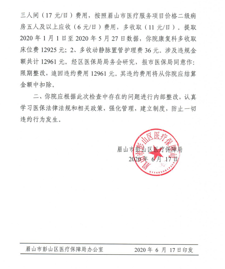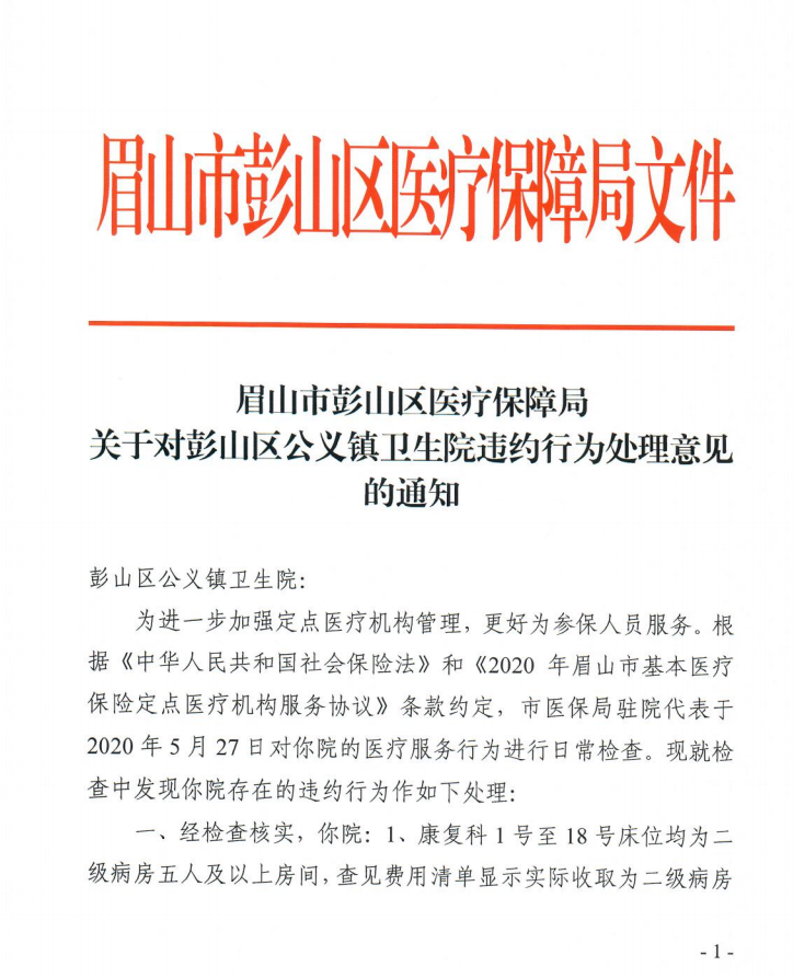 眉山市彭山区医疗保障局关于对公义镇卫生院违约行为处理意见的通知