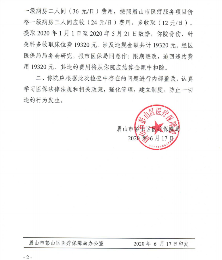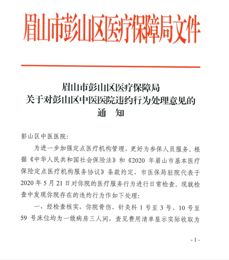 眉山市彭山区医疗保障局关于对彭山区中医院违约行为处理意见的通知