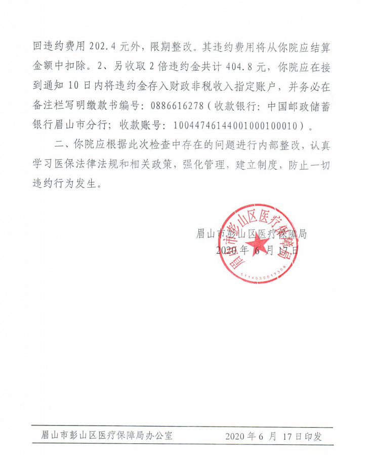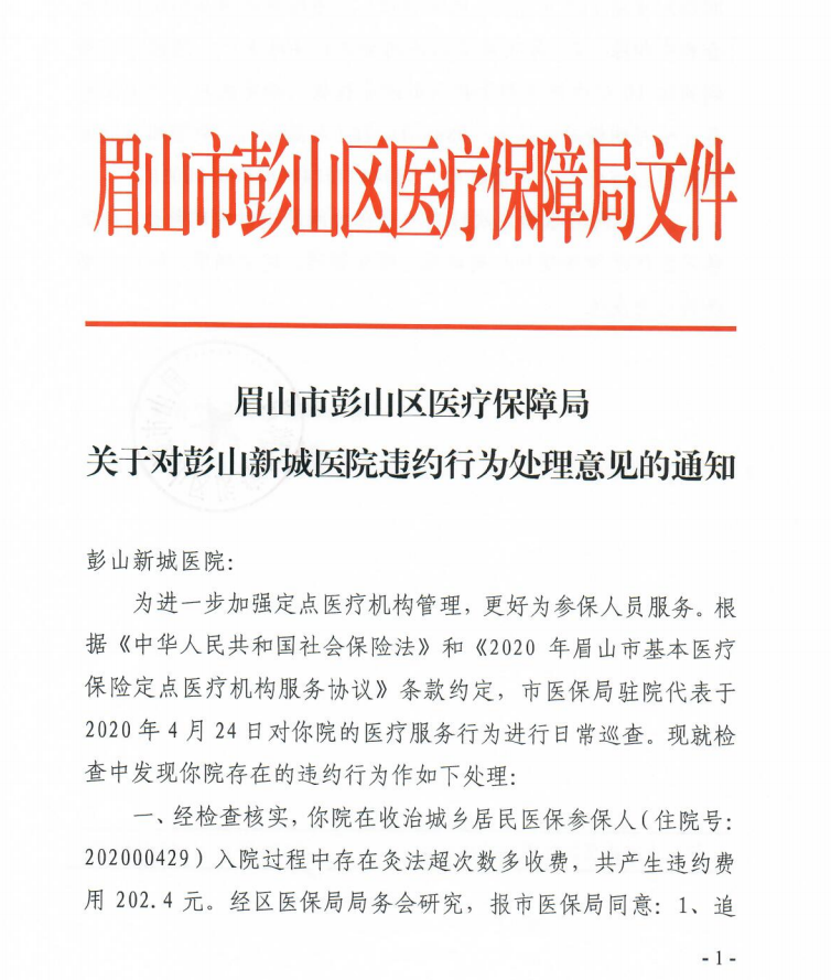 眉山市彭山区医疗保障局关于对新城医院违约行为处理意见的通知
