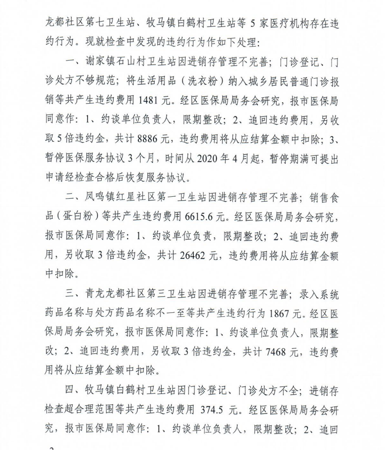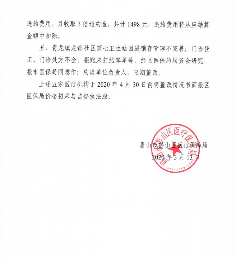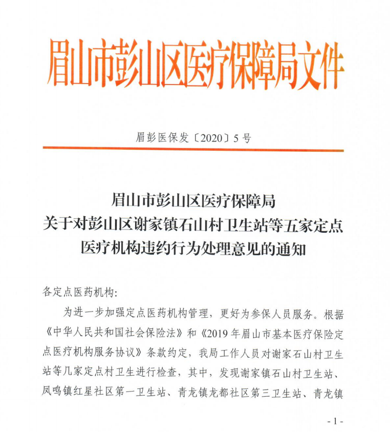 关于对彭山区谢家镇石山村卫生站等五家定点医疗机构违约行为处理意见的通知