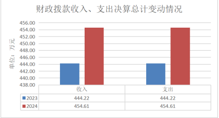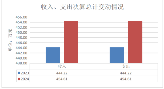 2024年度收、支总计均为454.61万元。与2023年度相比,收、支总计各增加10.39万元,增长2.34%。主要变动原因是2024年度本单位人员增加3人,导致人员经费增加。