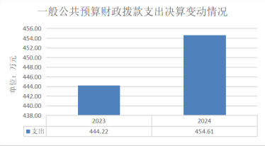 2024年度一般公共预算财政拨款支出454.61万元,占本年支出合计的100%。与2023年度相比,一般公共预算财政拨款支出增加10.39万元,增长2.34%。主要变动原因是2024年度本单位人员增加3人,导致人员经费增加。