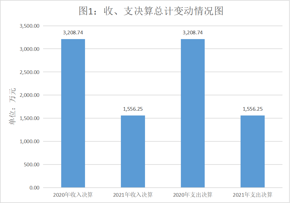 2021年度收、支总计1,556.25万元。与2020年相比,收、支总计各减少1,652.48万元,下降51.50%。主要变动原因是项目减少,项目支出减少。