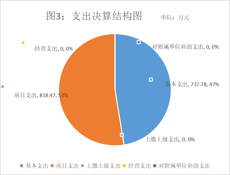 2021年本年支出合计1,556.25万元,其中:基本支出737.78万元,占47.41%;项目支出818.47万元,占52.59%;上缴上级支出0万元,占0%;经营支出0万元,占0%;对附属单位补助支出0万元,占0%。