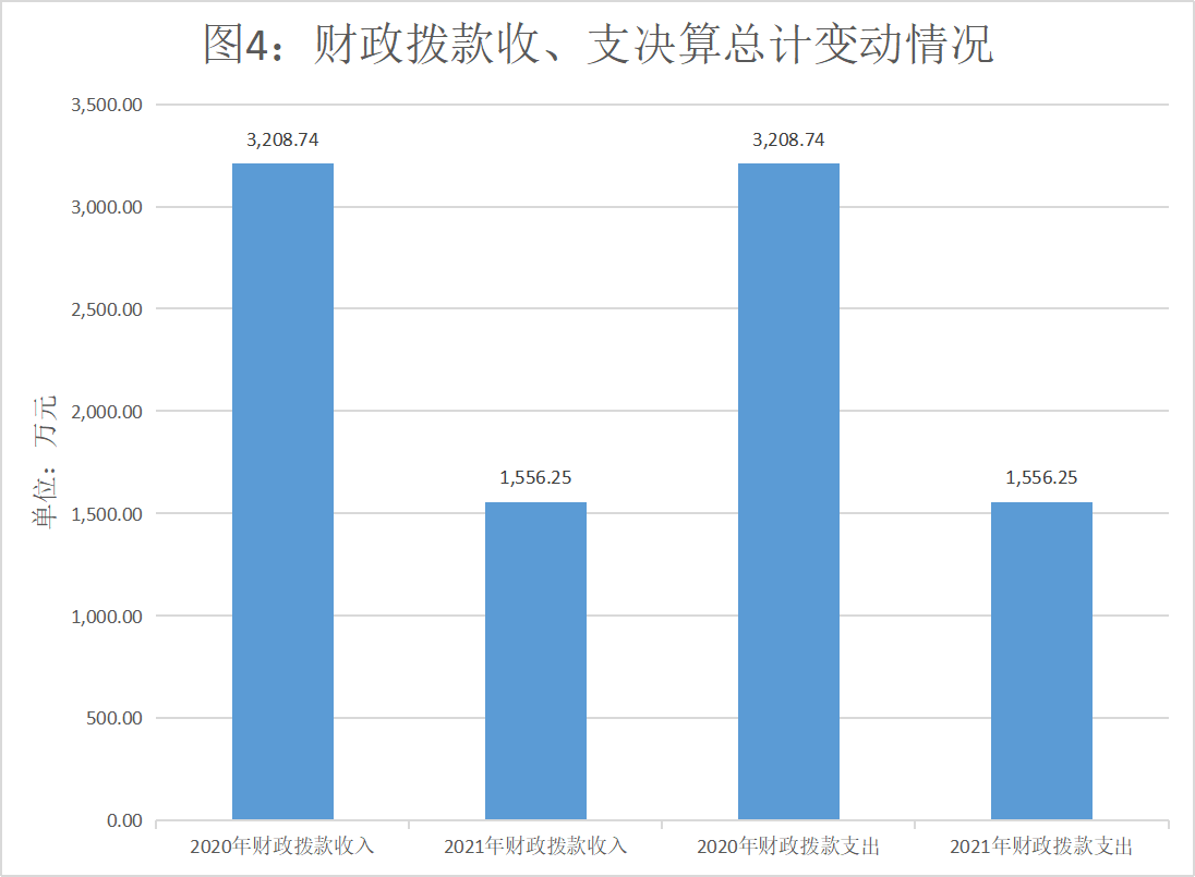 2021年财政拨款收、支总计1,556.25万元。与2020年相比,财政拨款收、支总计各减少1,652.48万元,下降51.50%。主要变动原因是项目减少,项目支出减少。