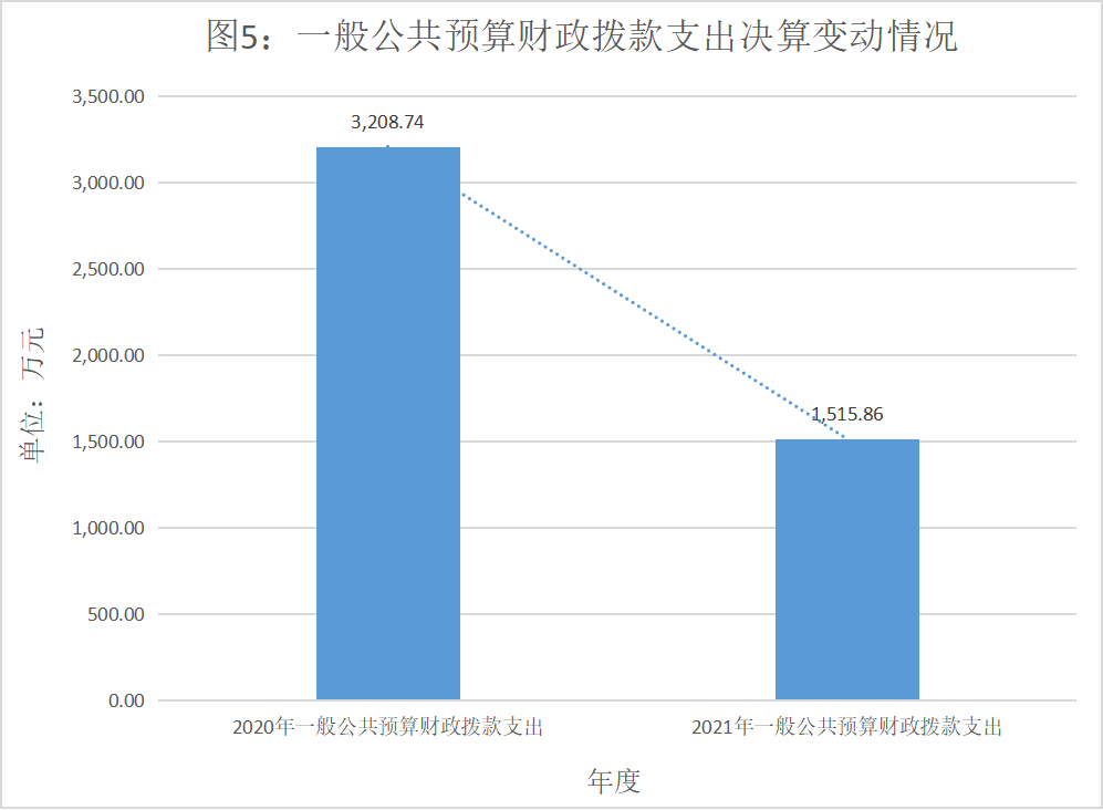 2021年一般公共预算财政拨款支出1,515.86万元,占本年支出合计的97.40%。与2020年相比,一般公共预算财政拨款支出减少1,692.88万元,下降52.76%。主要变动原因是项目减少,项目支出减少。