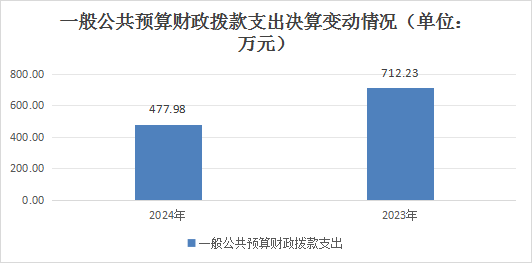 2024年一般公共预算财政拨款支出477.98万元,占本年支出合计的95.77%。与2023年相比,一般公共预算财政拨款支出减少234.25万元,下降32.89%。主要变动原因是财政拨款减少。