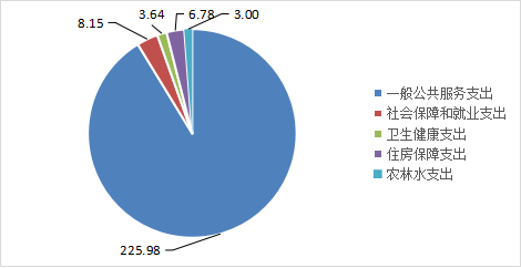2022年度彭祖山发展推进中心一般公共预算财政拨款支出247.54万元,主要用于以下方面:一般公共服务支出(类)225.98万元,占91.29%;农林水支出(类)3万元,占1.21%;社会保障和就业支出(类)8.15万元,占3.29%;卫生健康支出(类)3.64万元,占1.47%;住房保障支出(类)6.78万元,占2.74%;