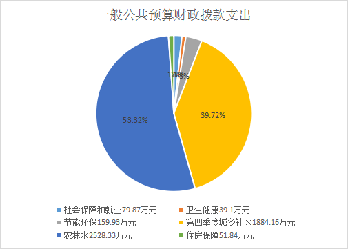 2020年一般公共预算财政拨款支出4743.23万元,主要用于以下方面:社会保障和就业(类)支出79.87万元,占1.68%;卫生健康支出39.1万元,占0.82%;节能环保支出159.93万元,占3.37%;城乡社区支出1884.16万元,占39.72%;农林水支出2528.33万元,占53.32%;住房保障支出51.84万元,占1.09%。(罗列全部功能分类科目,至类级。)