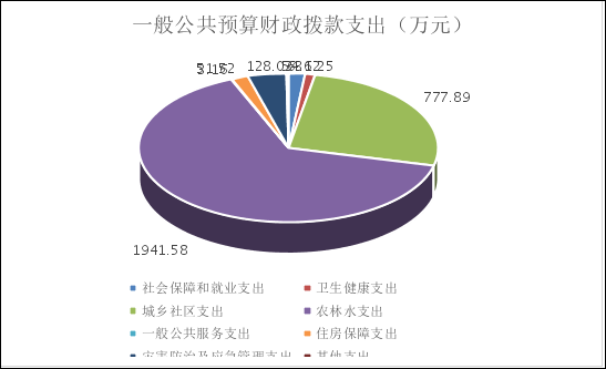 2021年一般公共预算财政拨款支出 2994.34 万元,主要用于以下方面: 一般公共服务(类) 支出 3.16 万元,占 0.1 %; 城乡社区内支出 777.89万元, 占 25.97 % ; 农林水支出1941.58万元, 占 64.92 %; 社会保障和就业(类) 支出 54.62 万元,占 1.82 %; 卫生健康支出 31.25 万元,占 1.04 %;住房保障支出 51.52 万元,占 1.72 %; 灾害防治及应急管理支出 128.03万元,占4.27%,其他支出6万元,占0.2% 。