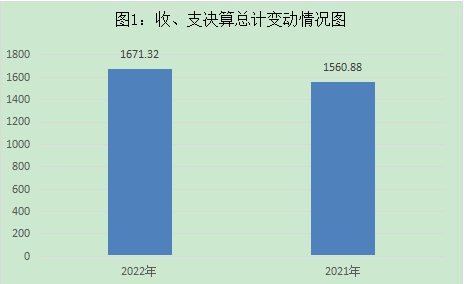 2022年度收、支总计1,671.32万元。与2021年相比,收、支总计均增加110.44万元,增长7.1%。主要变动原因是区道安办没有财政账户,所有预算在本单位账户,其申请的政府性基金264.62万使交警队总预算增加,如除开这笔资金,实际用于本单位开支的预算是减少的。