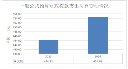 2024年度一般公共预算财政拨款支出454.61万元,占本年支出合计的100%。与2023年度相比,一般公共预算财政拨款支出增加10.39万元,增长2.34%。主要变动原因是2024年度本单位人员增加3人,导致人员经费增加。
