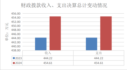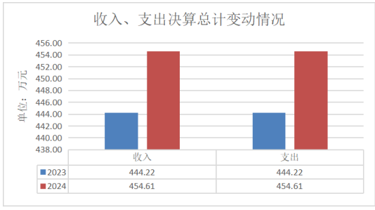 2024年度收、支总计均为454.61万元。与2023年度相比,收、支总计各增加10.39万元,增长2.34%。主要变动原因是2024年度本单位人员增加3人,导致人员经费增加。