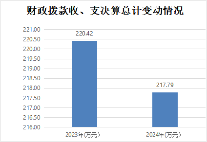 2024年财政拨款收、支总计217.79万元。与2023年相比,财政拨款收、支总计各减少2.63万元,下降1.19%。主要变动原因是2024年基本支出减少。