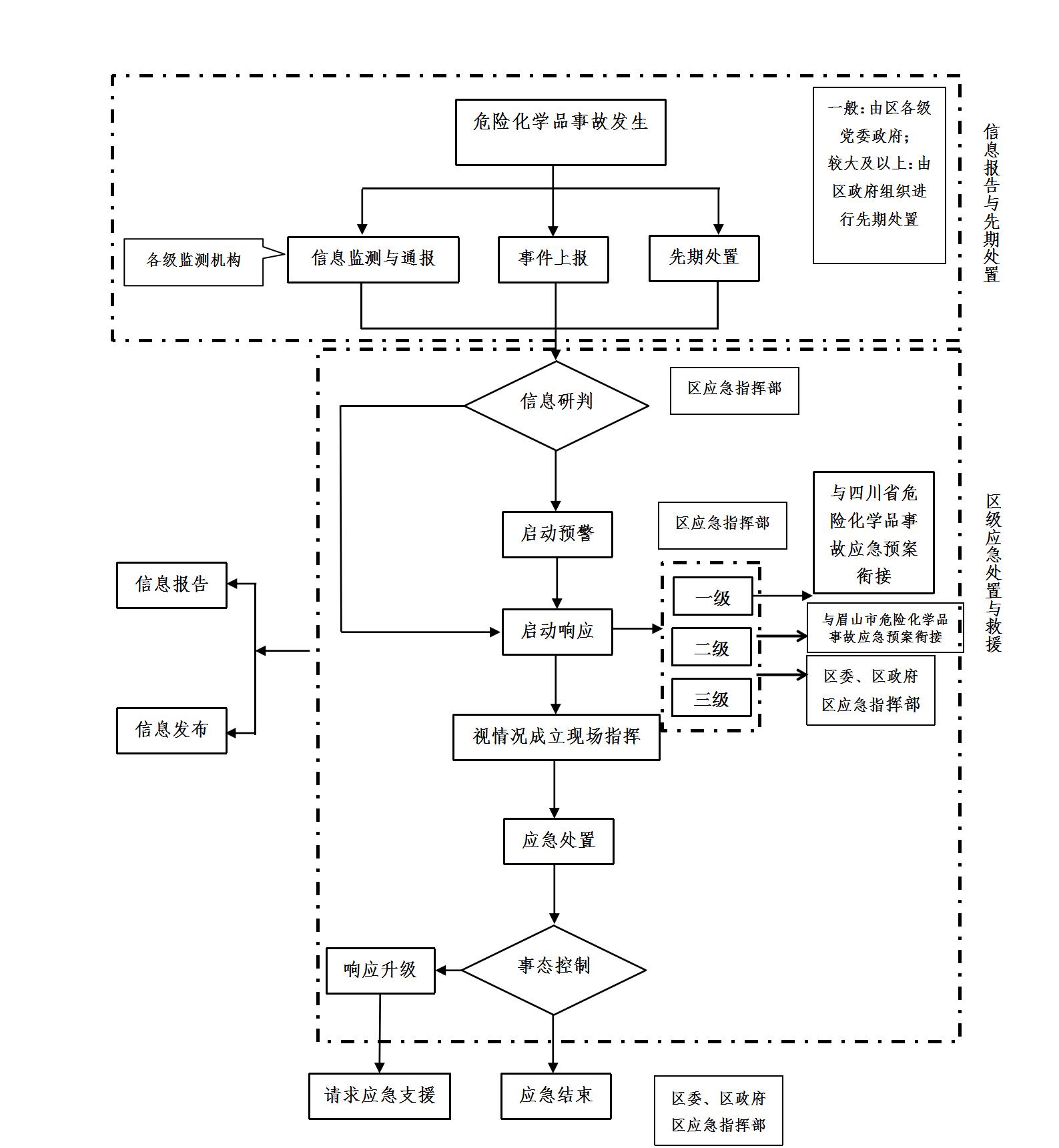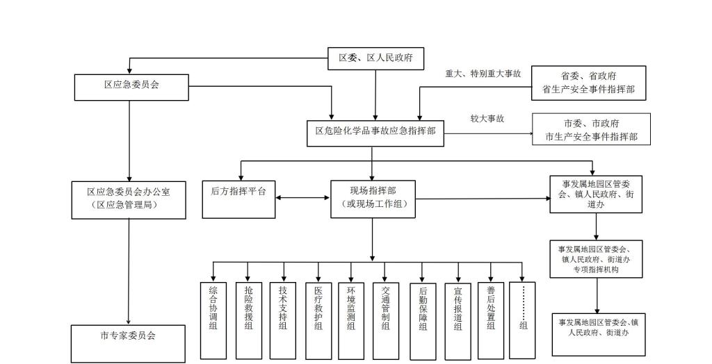经初判发生特别重大、重大事故、较大事故时,由区政府组织进行先期应对,同时报请省/市政府组织应对,当省/市政府组织应对时,区专项组织指挥机构按照要求具体组织调度。